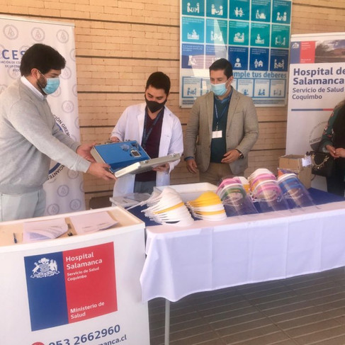 ACESA AG y sus asociados donan equipamiento clínico y elementos de protección personal (EPP) al Hospital de Salamanca. Se trata de 120 unidades de escudos faciales, un capnógrafo y un videolaringoscopio para reforzar la capacidad de manejo de paciente crítico en el servicio de Urgencia en la contingencia por COVID19. Mayo 2020.